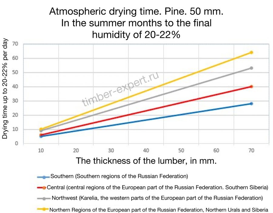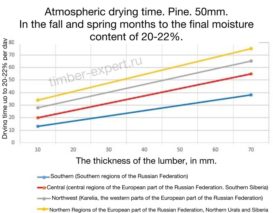 The diagrams below show the approximate drying time for softwood lumber (pine, spruce) to a final moisture content of 20-22%.