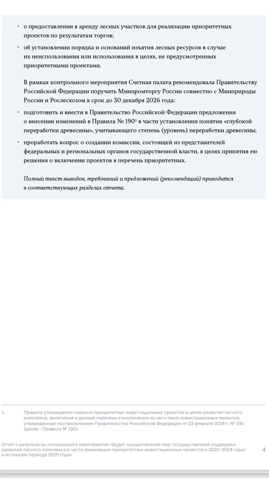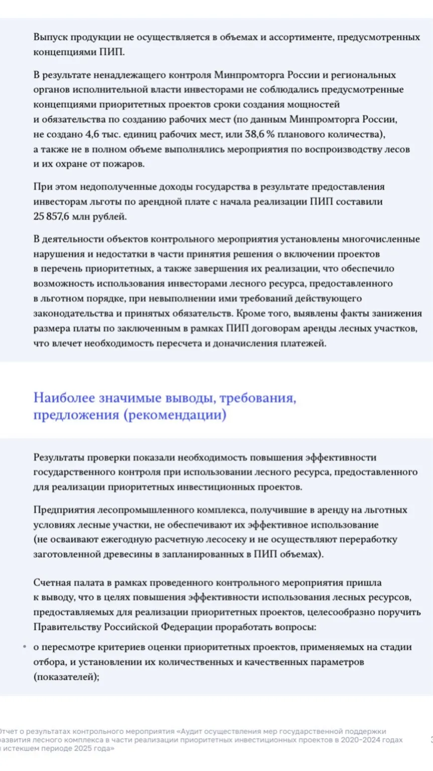 Проверка была проведена не абы где, а в четырёх ключевых лесных регионах страны — Архангельской, Вологодской, Иркутской областях и Красноярском крае. Именно там сосредоточены крупнейшие массивы древесины, выделенные под ПИП, то есть основной ресурс, на котором и должна была строиться вся логика развития отрасли.
